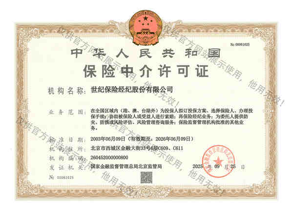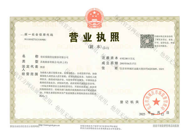 9月,经国家金融监督管理总局北京监管局和北京市西城区市场监督管理局核准,世纪保险经纪股份有限公司的办公住所变更至“北京市西城区金融大街33号6层C609、C611”。